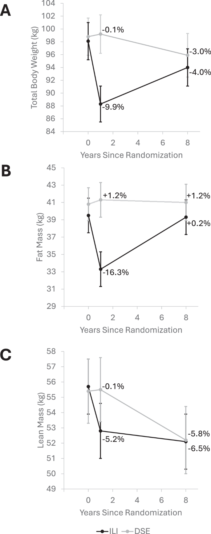 Das ist schon eine auch für mich überraschende Wirkung für eine eher gemächliche Abnahmemethode, in der die Teilnehmer nach einem Jahr von einem durchschnittlichen Ausgangsgewicht von 98 Kilogramm aus nur ungefähr 10 Kilogramm verloren hatten. Deutlich kann man hier auch sehen, daß nach diesem einen Jahr die Wiederzunahme einsetzte, und das nicht nur vorübergehend, sondern im Laufe von acht Jahren zwei Drittel des Abnahmeerfolgs wiederaufzehrend. Wobei sich die Fettmasse in diesem Zeitraum komplett wiederherstellte, aber die fettfreie Masse nicht.